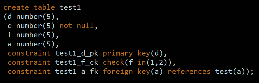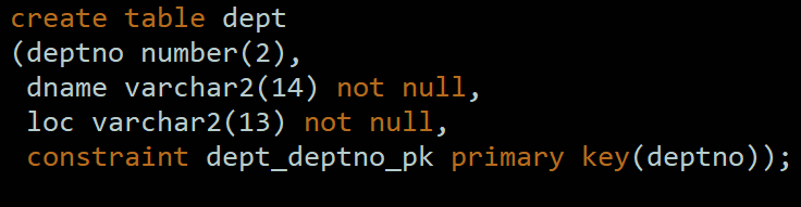 - not null 제약 조건은 컬럼옆에 사용 // dname char(10) not null