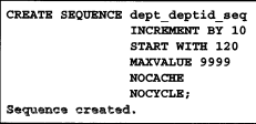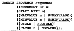 cycle | nocycle : 최대값 또는 최소값에 도달한 이후에도 시퀸스가 계속 값을 생성할지 여부를 지정 , nocycle이 디폴트 값
