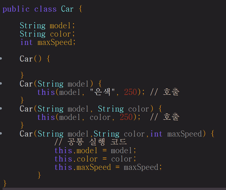 필드 초기화 내용은 한 생성자에만 집중적으로 작성하고 나머지 생성자는 초기화 내용을 가지고 있는 생성자를 호출