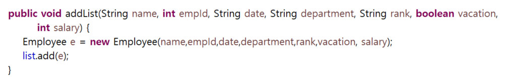 메소드를 통해 받은 매개변수들을 employee 객체를 만든뒤 ArrayList에 저장한다.