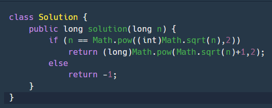 1. int형으로 변환한 제곱근의 제곱이 n과 같다면 1을 더한값의 제곱을 형 변환 후 리턴