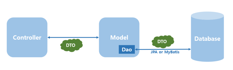 DTO는 로직을 가지지 않는 데이터 객체이고 getter/setter 메소드만 가진 클래스를 의미