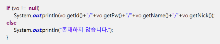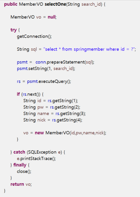 리턴받은 MemberVO 객체가 null이면 resultset의 결과가 없는것이기 때문에 기본값 null이 반환된것이다.