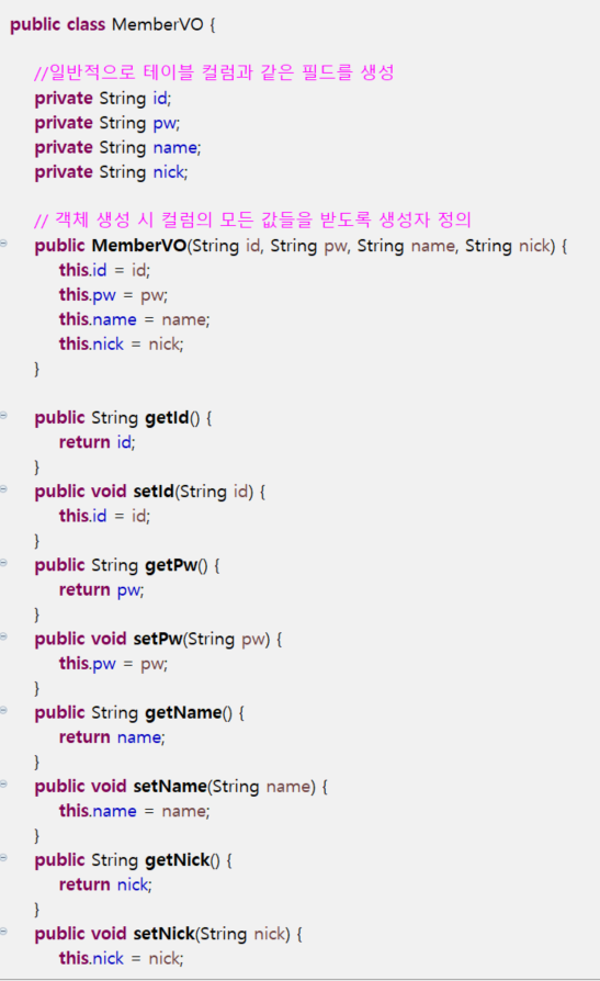 컬럼의 값들을 하나로 묶어 줄 MemberVO 클래스를 먼저 만들겠다. dao 패턴의 dto에 해당한다.