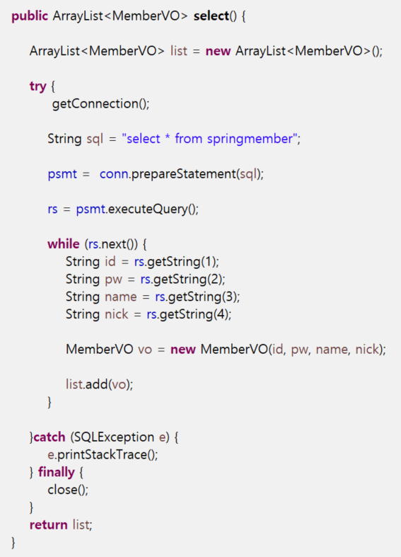 리턴받는 값은 MemberVO 타입의 ArrayList이다.