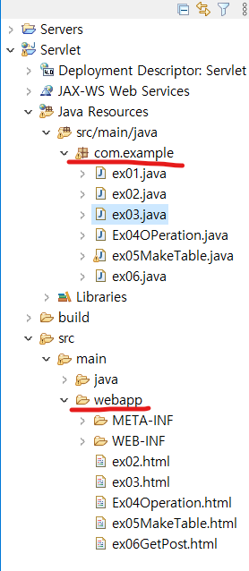 1. 먼저 패키지안에 servlet 파일, webapp 폴더에 html 폴더를 각각 만들어준다.
