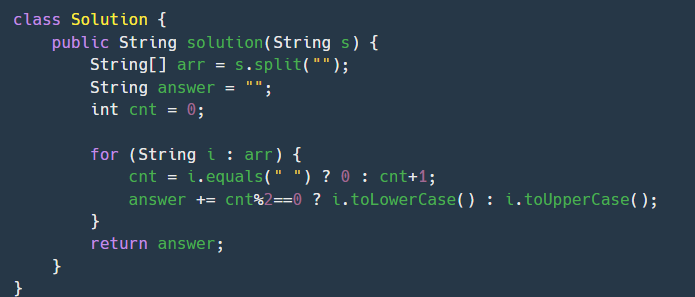 4. cnt값이 answer앞에서 증가하므로 cnt가 짝수이면 소문자로, 홀수이면 대문자로 변환해서 answer에 더해준다.