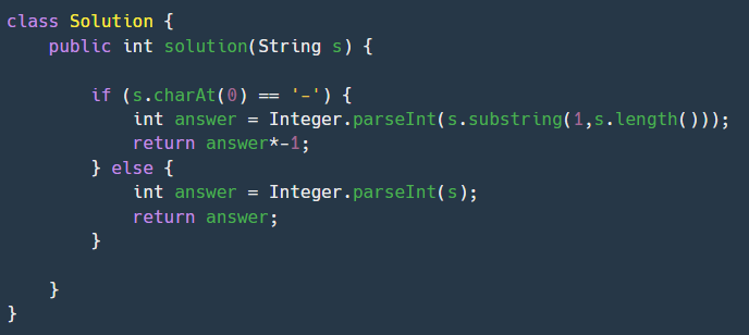 1. 문자열 s의 첫 글자가 -이면 문자열을 부호 다음부터 슬라이싱한 후 정수로 변환해준 뒤 -1을 곱해서 리턴