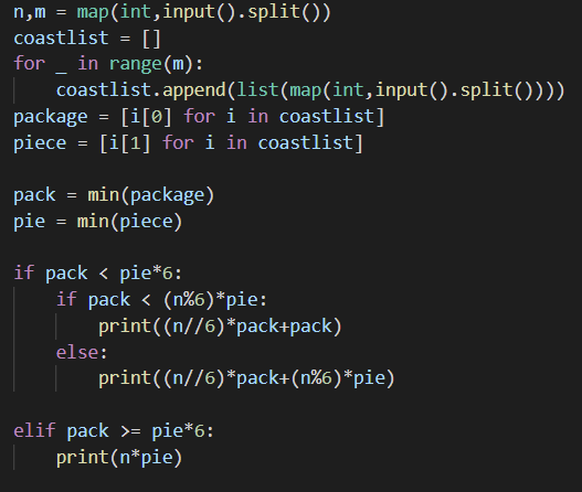 첫째 줄에 N과 M이 주어진다. N은 100보다 작거나 같은 자연수이고, M은 50보다 작거나 같은 자연수이다. 둘째 줄부터 M개의 줄에는 각 브랜드의 패키지 가격과 낱개의 가격이 공백으로 구분하여 주