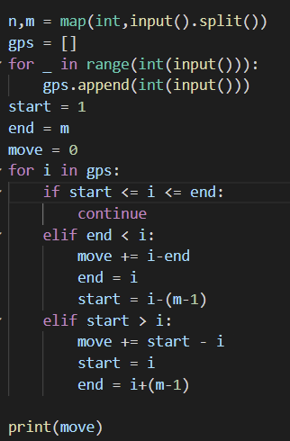 상근이는 오락실에서 바구니를 옮기는 오래된 게임을 한다. 스크린은 N칸으로 나누어져 있다. 스크린의 아래쪽에는 M칸을 차지하는 바구니가 있다. (M<N) 플레이어는 게임을 하는 중에 바구니를