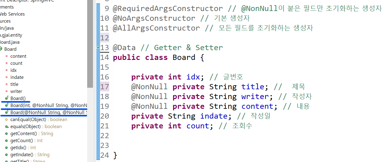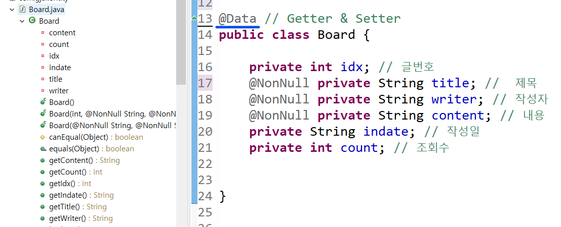 Getter & Setter 생성 어노테이션 // 필드를 바꾸거나 추가할 때 마다 자동으로 메소드가 생성된다.