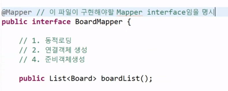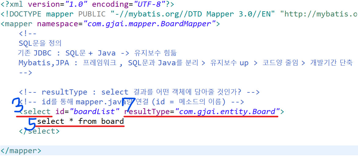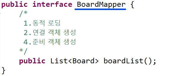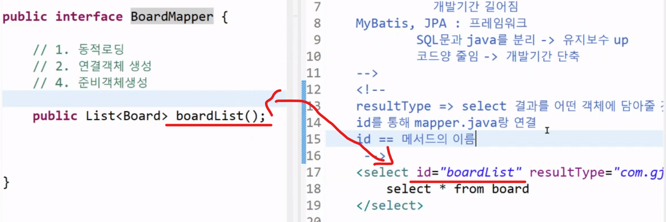 BoardMapper.java 메소드와 BoardMapper.xml의 <select>태그는 서로 연결되어있다.