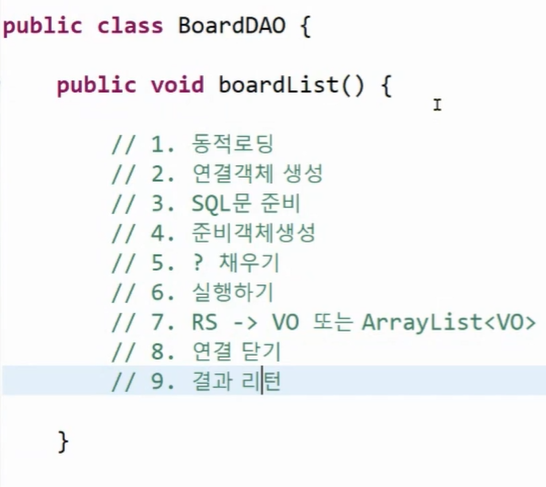 jdbc 모든 과정을 사용자가 처리해 줄 필요가 없기때문에 메소드를 구현(중괄호) 할 필요가 없다.