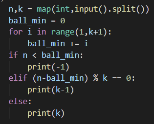 $N$개의 공을 $K$개의 바구니에 문제의 규칙을 만족하면서 나눠 담을 수 있다면, 가장 많이 담긴 바구니와 가장 적게 담긴 바구니의 공의 개수 차이를 출력한다. 나눠 담을 수 없는 경우에는 -1을