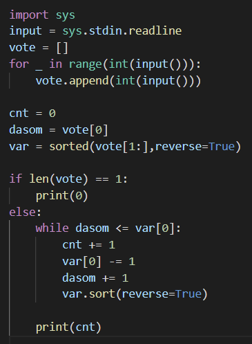 1. 투표리스트의 첫번째 값이 다른 투표값들의 최고값보다 커질때까지 반복해서 구해준다.