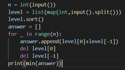 1. 리스트의 0번째 인덱스값과 -1번째 인덱스값을 더한것의 최솟값을 구해주면 된다.