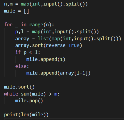 첫째 줄에는 과목 수 n (1 ≤ n ≤ 100)과 주어진 마일리지 m (1 ≤ m ≤ 100)이 주어진다. 각 과목마다 2줄의 입력이 주어지는데 첫째 줄에는 각 과목에 신청한 사람 수 Pi과 과목의 수강인원 Li이 주어