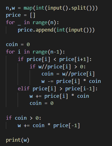 입력은 표준입력을 사용한다. 첫 번째 줄에 요일 수를 나타내는 양의 정수 n과 초기 현금 W(1 ≤ n ≤ 15, 1 ≤ W ≤ 100,000)가 주어진다. 다음 n 개의 줄에서, i번째 줄은 i일의 바이트 코인 가격을 나