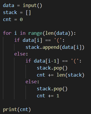 2. ()가 나오면 레이저이므로 스택에서 제거해주고 스택의 길이만큼 쇠막대기가 생성대므로 카운트에 더해준다.