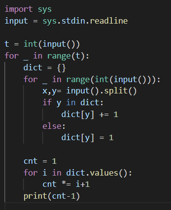 첫 번째 테스트 케이스는 headgear에 해당하는 의상이 hat, turban이며 eyewear에 해당하는 의상이 sunglasses이므로 (hat), (turban), (sunglasses), (hat,sunglasses), (turban,sunglasses)로 총 5가지 이다.