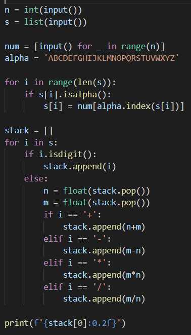 첫째 줄에 피연산자의 개수(1 ≤ N ≤ 26) 가 주어진다. 그리고 둘째 줄에는 후위 표기식이 주어진다. (여기서 피연산자는 A~Z의 영대문자이며, A부터 순서대로 N개의 영대문자만이 사용되며, 길이