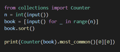 첫째 줄에 오늘 하루 동안 팔린 책의 개수 N이 주어진다. 이 값은 1,000보다 작거나 같은 자연수이다. 둘째부터 N개의 줄에 책의 제목이 입력으로 들어온다. 책의 제목의 길이는 50보다 작거나 같고