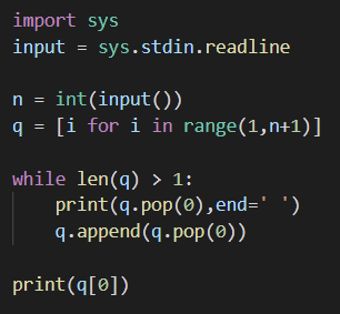 N장의 카드가 있다. 각각의 카드는 차례로 1부터 N까지의 번호가 붙어 있으며, 1번 카드가 제일 위에, N번 카드가 제일 아래인 상태로 순서대로 카드가 놓여 있다. 이제 다음과 같은 동작을 카드가