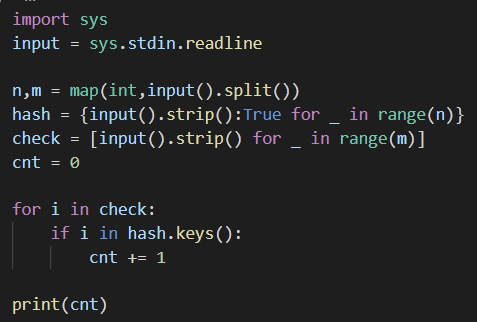 첫째 줄에 문자열의 개수 N과 M (1 ≤ N ≤ 10,000, 1 ≤ M ≤ 10,000)이 주어진다. 다음 N개의 줄에는 집합 S에 포함되어 있는 문자열들이 주어진다. 다음 M개의 줄에는 검사해야 하는 문자열들이 주어