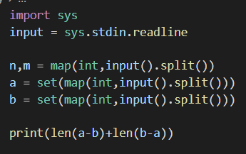첫째 줄에 집합 A의 원소의 개수와 집합 B의 원소의 개수가 빈 칸을 사이에 두고 주어진다. 둘째 줄에는 집합 A의 모든 원소가, 셋째 줄에는 집합 B의 모든 원소가 빈 칸을 사이에 두고 각각 주어