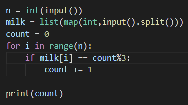 1. 0-1-2-0 이순서대로 우유를 마셔야하기때문에 milk[i]을 count를 3으로 나누어준 값으로 비교하면 된다.
