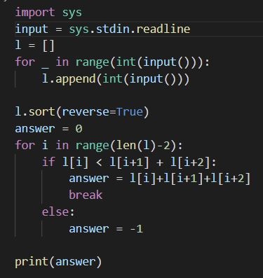 첫째 줄에 빨대의 개수 N이 주어진다. N은 3보다 크거나 같고, 1,000,000보다 작거나 같은 자연수이다. 둘째 줄부터 N개의 줄에 빨대의 길이가 한 줄에 하나씩 주어진다. 빨대의 길이는 1,000,000보다