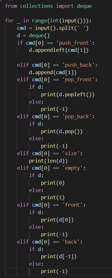 Algorithm/Backjoon <10866> 덱 gambae 2022. 3. 31. 20:05 https://www.acmicpc.net/problem/10866 10866번: 덱 첫째 줄에 주어지는 명령의 수 N (1 ≤ N ≤ 10,000)이 주어진다. 둘째 줄부터 N개의 줄에는 명령이 하나씩 주어진다. 주어지는 정수는 1보다 크거나 같고, 100,000보다 작거나 같다. 문제에 나와있지 www.acmicpc.net 풀이과정 1. 덱을 이용한 단순구현 정답 느낀점 1.easy