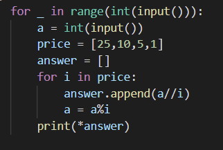 각 테스트케이스에 대해 필요한 쿼터의 개수, 다임의 개수, 니켈의 개수, 페니의 개수를 공백으로 구분하여 출력한다.