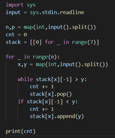 첫째 줄에 멜로디에 포함되어 있는 음의 수 N과 한 줄에 있는 프렛의 수 P가 주어진다. (N ≤ 500,000, 2 ≤ P ≤ 300,000) 다음 N개 줄에는 멜로디의 한 음을 나타내는 두 정수가 주어진다. 첫 번째 정수